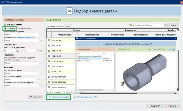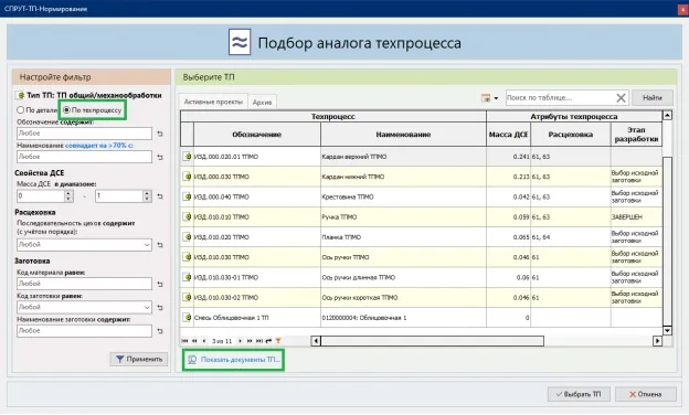 - Подбор аналога ТП. Для просмотра документов в окно «Подбор аналога техпроцесса» добавлена кнопка «Показать документы ТП…».