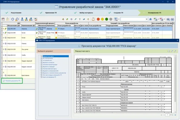 - Управление разработкой заказа. В окне Управление разработкой заказа добавлена кнопка «Показать документы ТП…» на этапах «Применение ТП» и «Планирование ТП».
