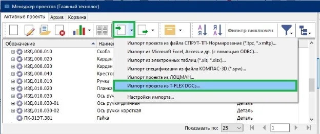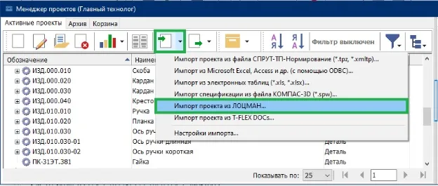Импорт проекта из ЛОЦМАН:PLM. В раздел «Импорт в СПРУТ-ТП-Нормирование» в Менеджере проектов добавлен пункт «Импорт проекта из ЛОЦМАН…» (ЛОЦМАН:PLM – АО «АСКОН»).