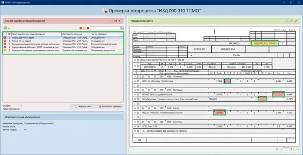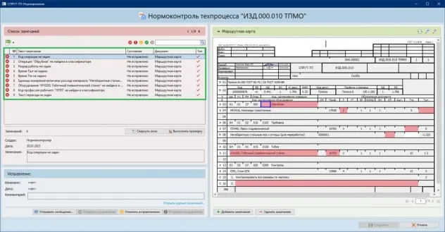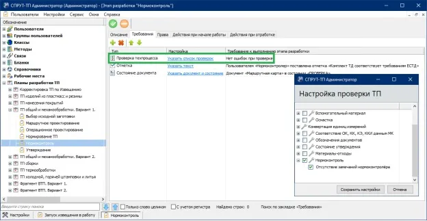 - «Нормоконтроль» обеспечивает автоматическую проверку технологического процесса, получение списка замечаний и организацию взаимодействия нормоконтролера с разработчиком ТП для исправления замечаний с целью получения безошибочного ТП.