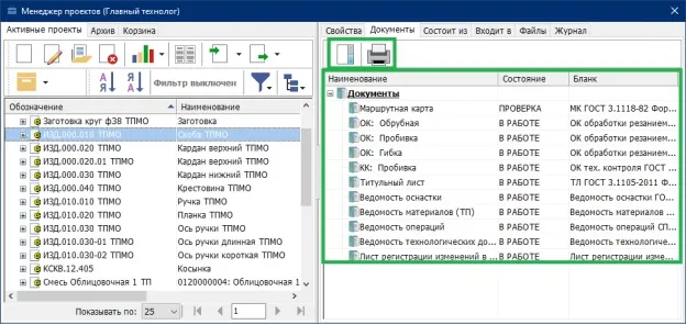 - Менеджер проектов. В правую часть добавлена закладка Документы. На закладке показываются документы выбранного объекта. Документы можно открыть на просмотр или распечатать.