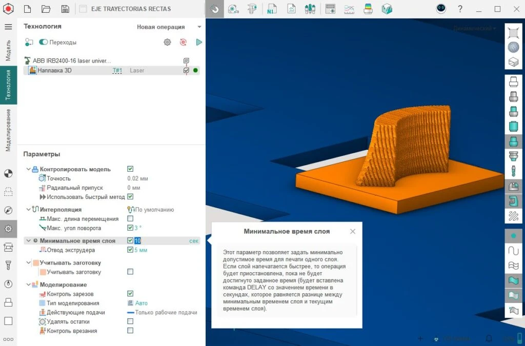 Для всех операций группы «Аддитивная» добавили новые параметры — минимальное время слоя и отвод экструдера.