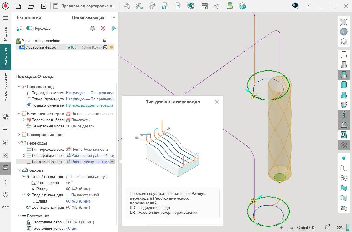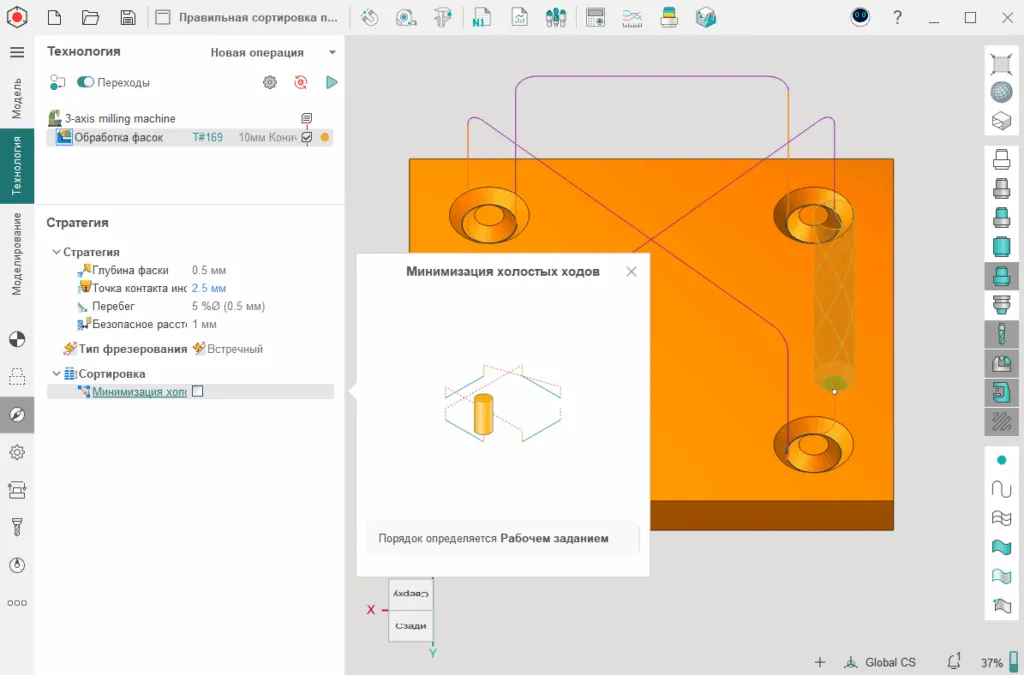 Добавили возможность ручной сортировки в рабочем задании последовательности обработки в операции Обработка фасок. Для этого нужно отключить опцию минимизация холостых ходов.