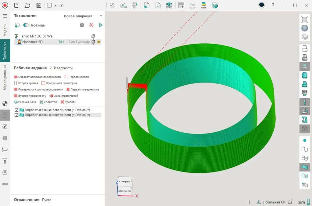 Аналогично ручная сортировка будет работать для нескольких групп поверхностей в операции Наплавка 5D. Меняя их порядок в рабочем задании, будет меняться последовательность обработки.
