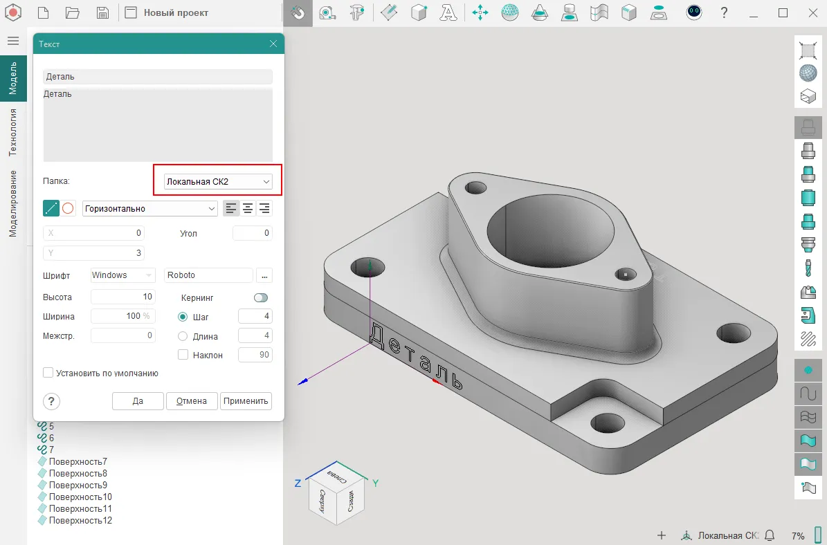 По умолчанию при работе с опцией «Текст» надпись для маркировки деталей создается в текущей локальной системе координат. В этом обновлении добавили возможность выбора системы координат, в которой можно создать текст. Например, создаем ЛСК на одной из граней детали, и указываем её, чтобы сразу правильно разместить нужный текст.